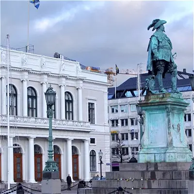 Gustaf Adolfs torg is a historic town square in central Gothenburg. Originally called Stortorget (“The Big Square”), it was renamed in 1854 when a statue of King Gustavus Adolphus—the founding father of Gothenburg—was erected. The square is surrounded by several notable buildings, including the city hall, the courthouse extension by Gunnar Asplund, the bourse (Börsen), and the city’s main harbour canal.